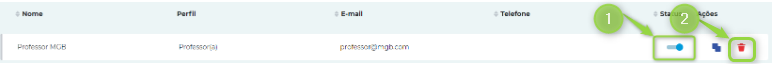Na coluna "Status" clique no ícone para ativar ou inativar um membro da equipe ou clique no ícone de "lixeira" para deletar.