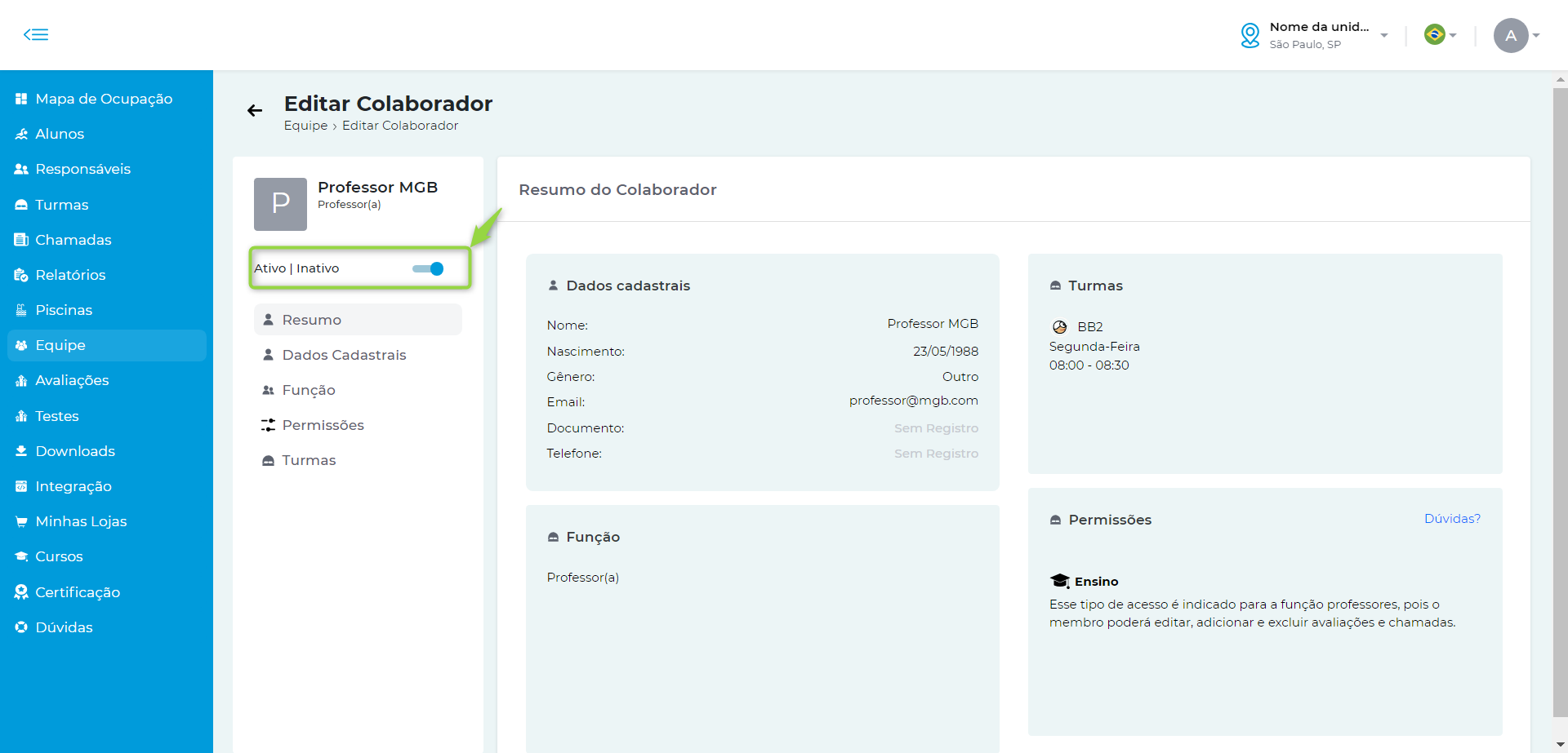 Importante: - Ao ativar ou inativar o cadastro, o membro da equipe terá ou não acesso a plataforma MGB |