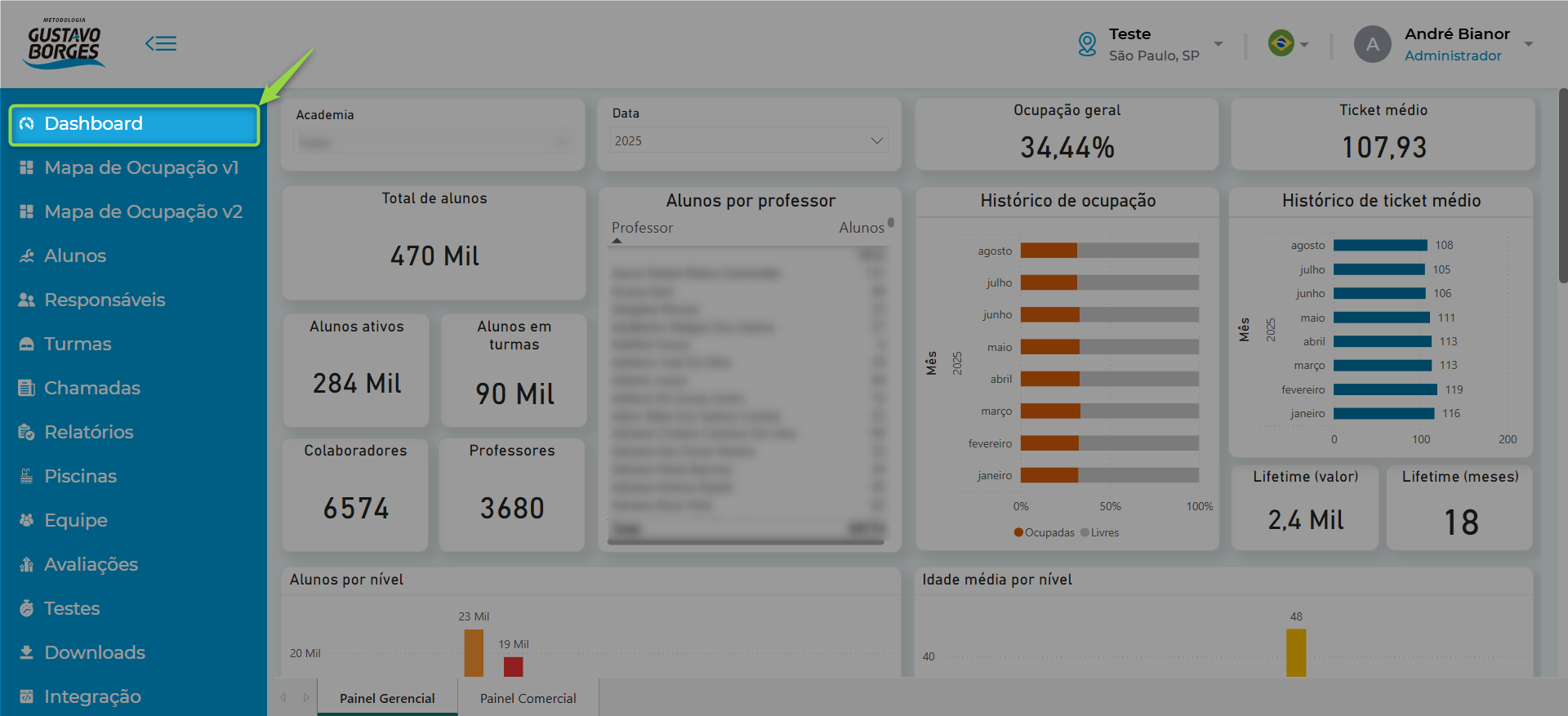 Importante: Filtro de academia. Caso o cliente tenha acesso a mais de uma academia, ele pode ver as informações das duas academias simultaneamente ou filtrar para ver apenas uma delas. |