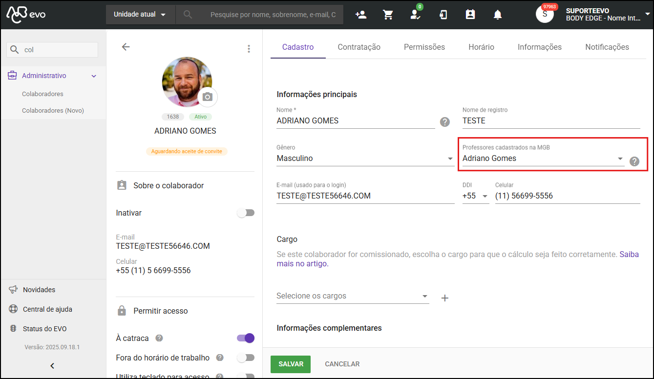 Vincular os professores cadastrados na MGB aos colaboradores no EVO no Menu Administrativo - Colaboradores.