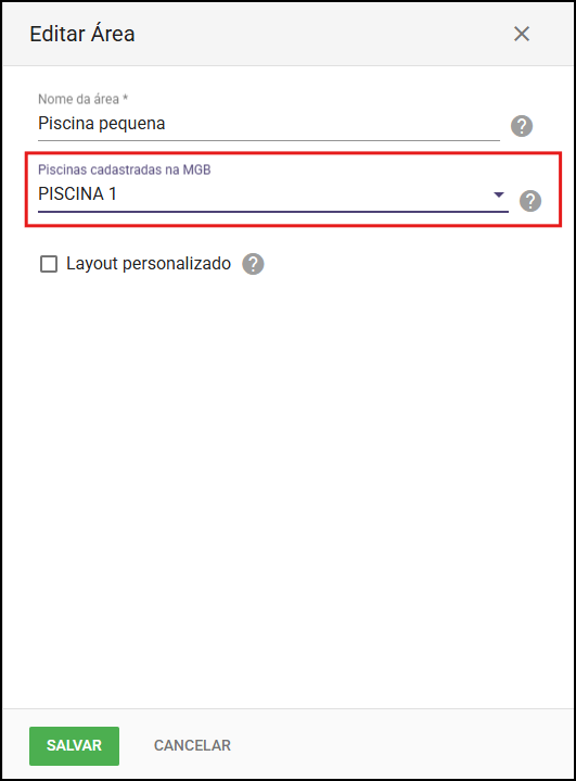Vincular as piscinas da MGB às suas respectivas áreas no EVO no Menu Administrativo - Áreas.