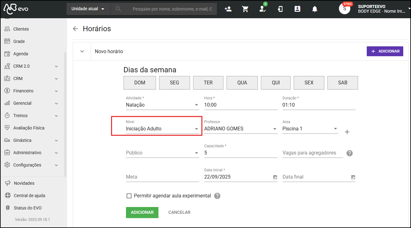 A atividade da grade deve possuir apenas um nível vinculado no EVO no Menu Administrativo - Atividades na grade.
